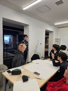 12/16からグループワークが始まりました。今回と次回は、5~6人のグループで、模造紙に製作案の再検討、製作物の正確な図面、工程表・役割分担について議論しています。1月から外で雪像づくりにはいります。