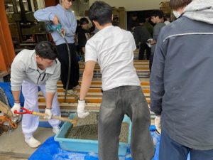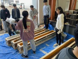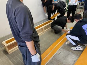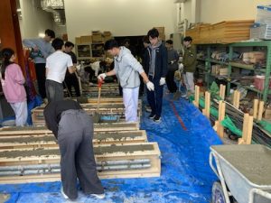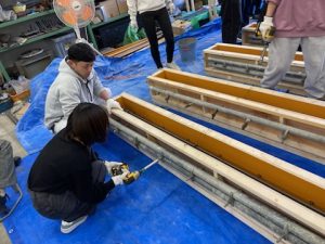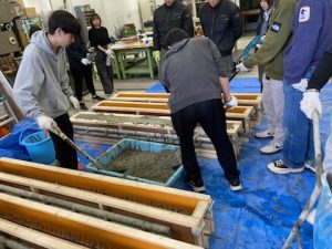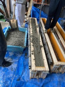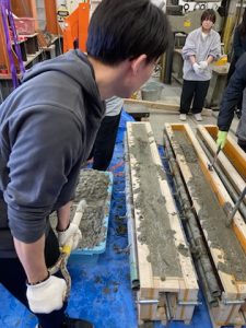 建築構造実験で加力するRC梁の製作のため、2025年10月2日に鉄筋組み立てと型枠作製、9日にコンクリート打設を行いました。